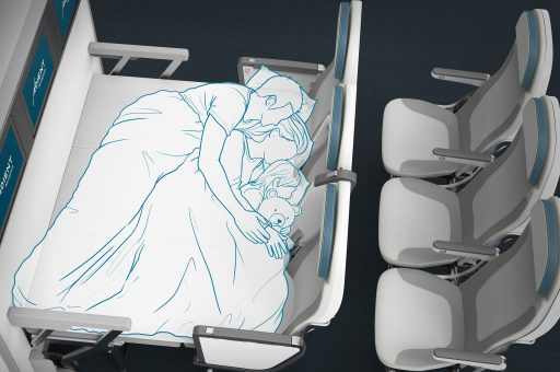 The concept of “Space for All” is to use the space between the bulkhead seats and the bulkhead wall to create an “extended flat surface to use as a lounge seat or, with all three deployed, a common space for children and adults,” the submission said. How? With the “help of individual extending mechanism that translates out from the lower bulkhead wall.”