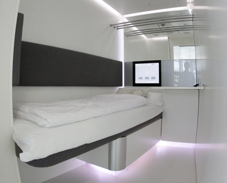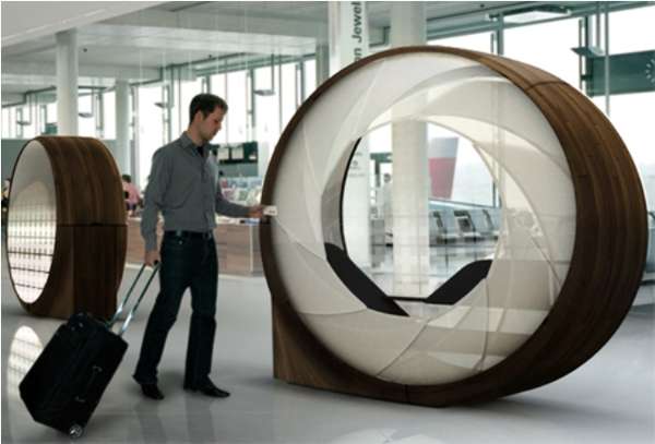 Even more minimal is the Obsideon Pod, designed by Roger Kellenberger. Envisioned as a branding opportunity for individual airlines as well as airports, the Obsideon Pod offers a loosely-defined private space for the passenger along with a secure bay for her hand luggage. Once reclined in the circular plod, its iris doors close so she may wrangle her e-mails, catch up on some proper work, or just grab a quick nap. According to Kellenberger’s design scheme, the passenger reserves the Obsideon Pod with her airline ticket to minimize user-experience friction.