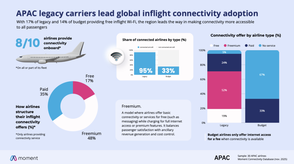 Moment’s survey frames these findings within a wider commercial outlook. As Moment CEO and Co-Founder Tanguy Morel explained, “The Asia-Pacific market is one of the most advanced connectivity ecosystems globally, with airlines demonstrating different stages of digital maturity. Legacy carriers are setting a very high benchmark, with connectivity increasingly embedded into loyalty ecosystems and premium value propositions, whereas regional airlines are leveraging connectivity to strengthen their brand promise and commercial strategy.”